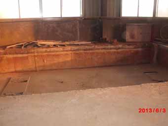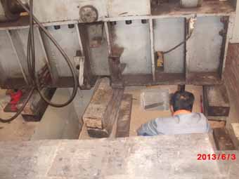 (3) 檢查機(jī)床設(shè)備聯(lián)接情況,確認(rèn)有無關(guān)聯(lián),解除后準(zhǔn)備拆除。減震墊 安裝的,如果機(jī)床底座和地平間距超過40mm,直接用叉車起吊;間距小于40mm的,用撬杠抬高后,加裝方木支撐;墊片安裝的,先鏟除混凝土,斷開墊片;直接安裝在地平上的設(shè)備(如投影儀、數(shù)控