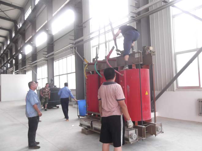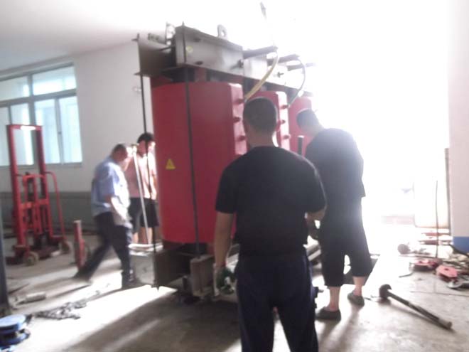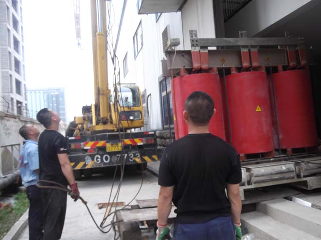 14、再次用千斤頂頂升變壓器,變壓器被頂升到需要的高度后,停止頂升,抽出變壓器下的排架,再用千斤頂配合,讓變壓器平穩(wěn)的落實(shí)到變壓器基礎(chǔ)上。核對變壓器位置中心符合設(shè)計要求。