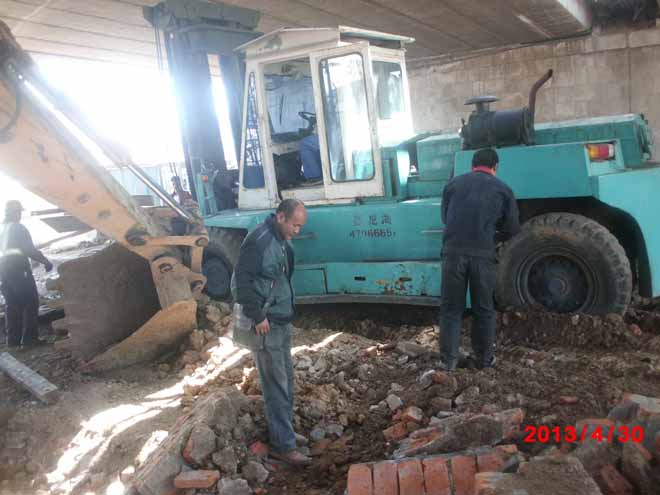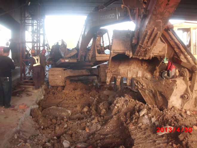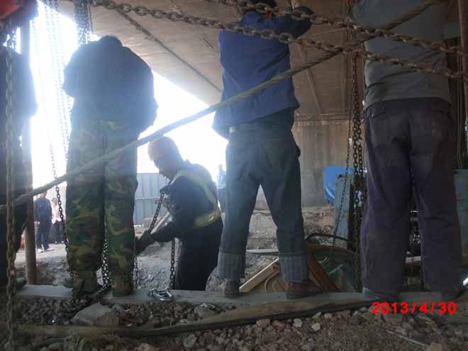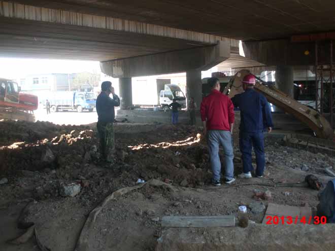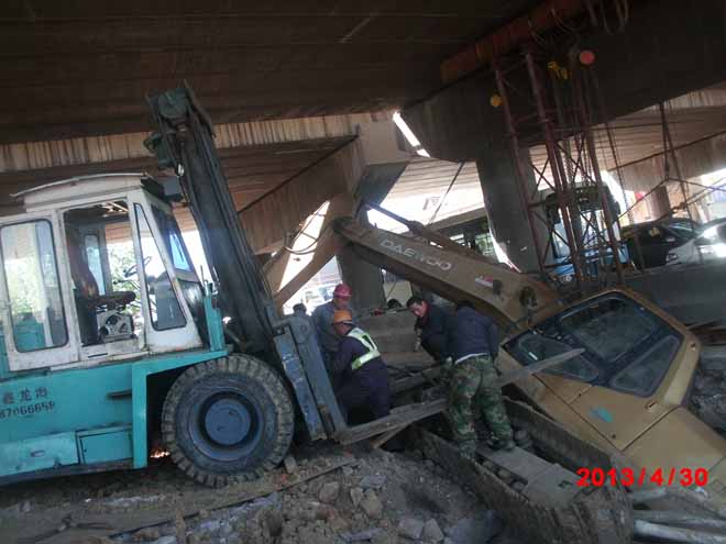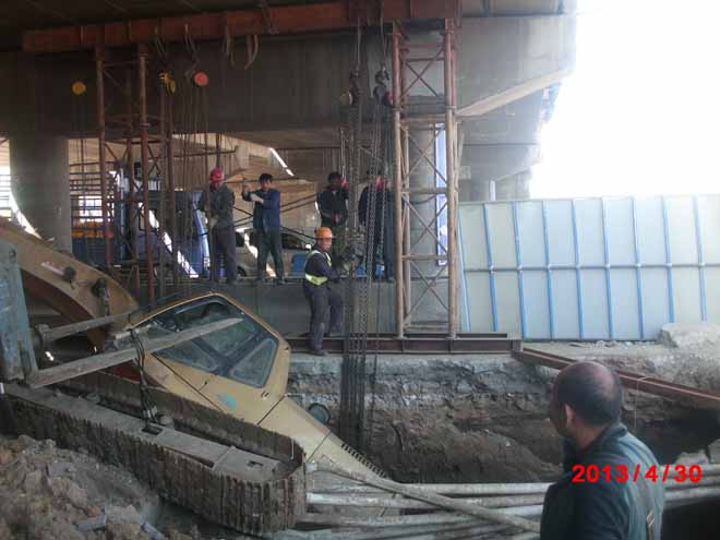2013年4月28號—4月30號青島汽車北站紅路燈橋底挖掘機吊裝現(xiàn)場。