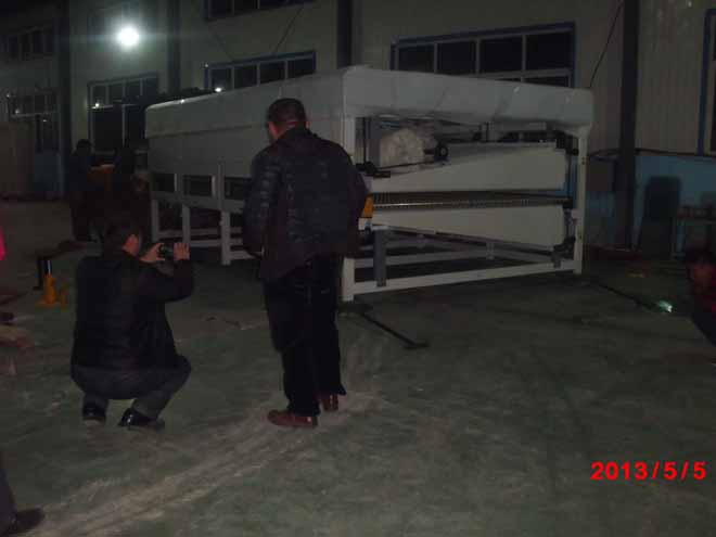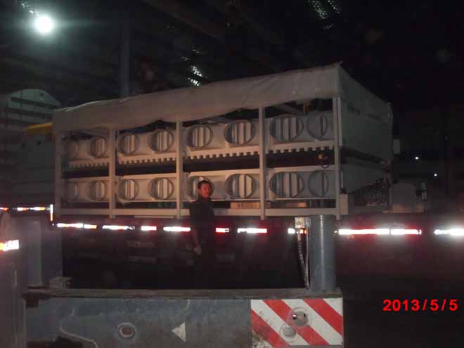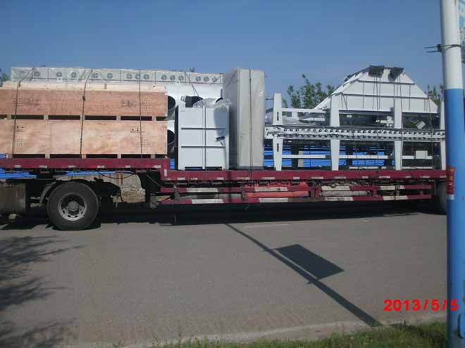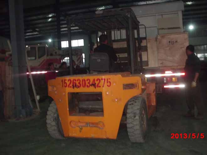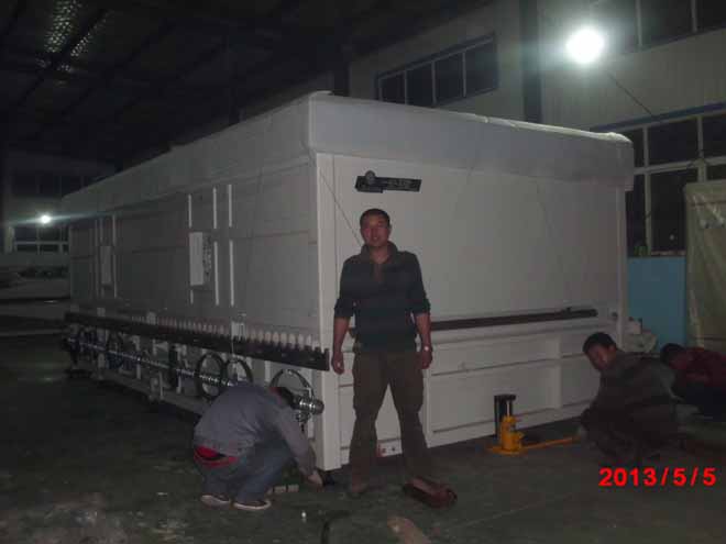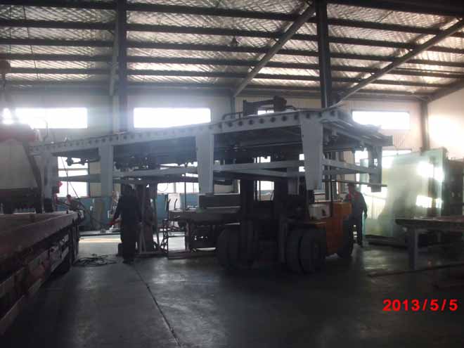 2013年5月5號(hào)(膠南)青島奧星玻璃有限公司26噸鋼化爐吊裝拖拉就位現(xiàn)場(chǎng)。